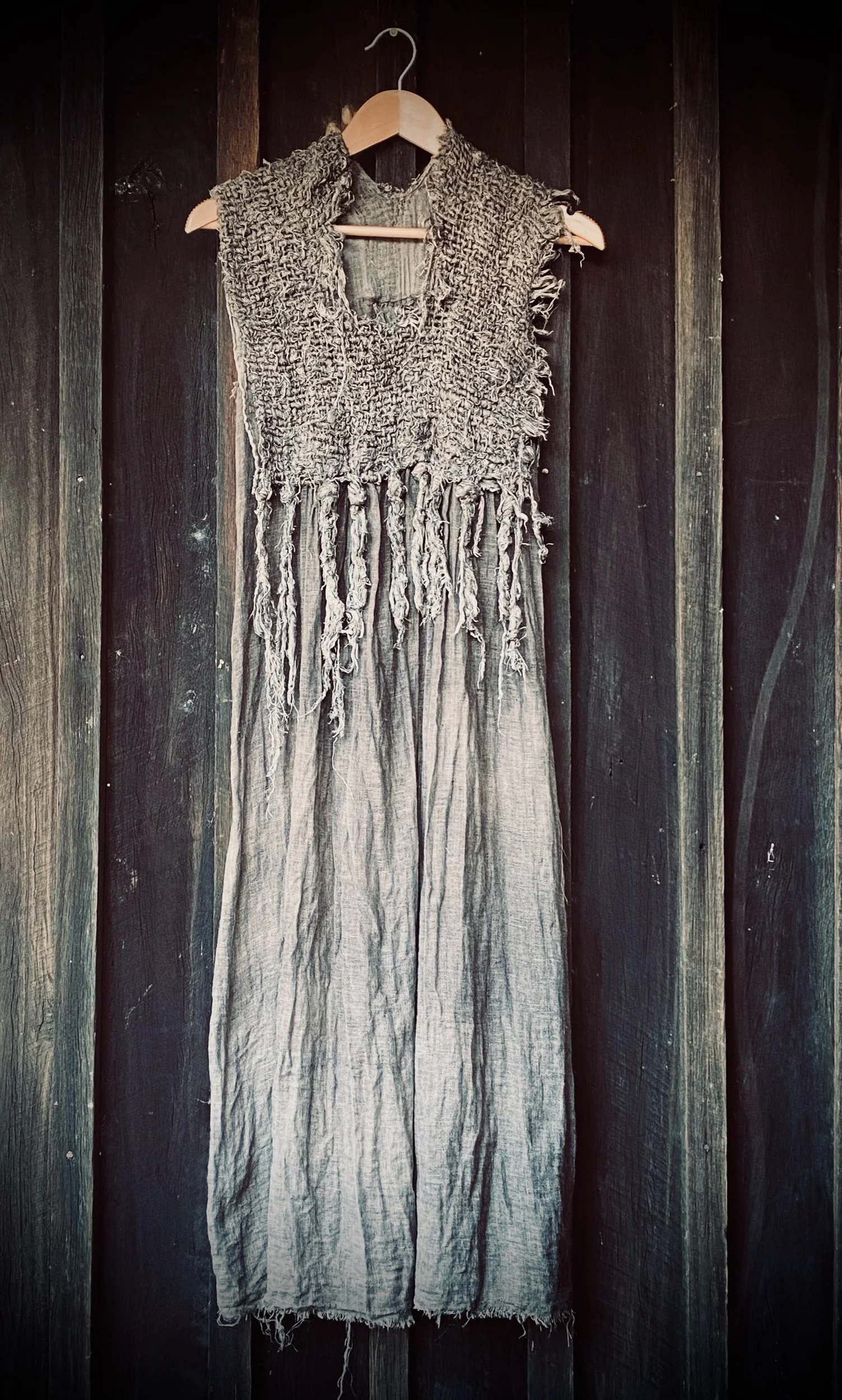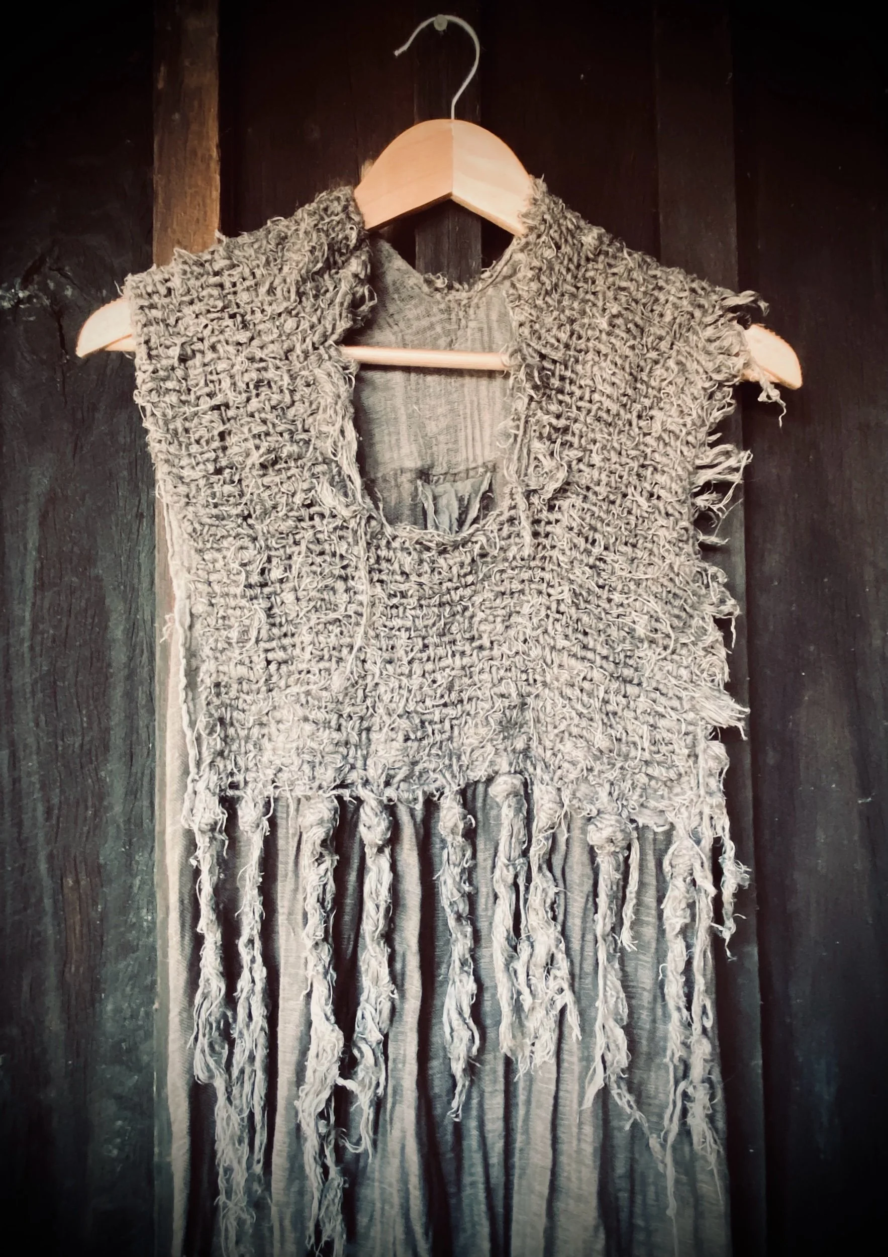 This top features raw edges around the V neck line and hemline. The hemline is slightly longer at the back.