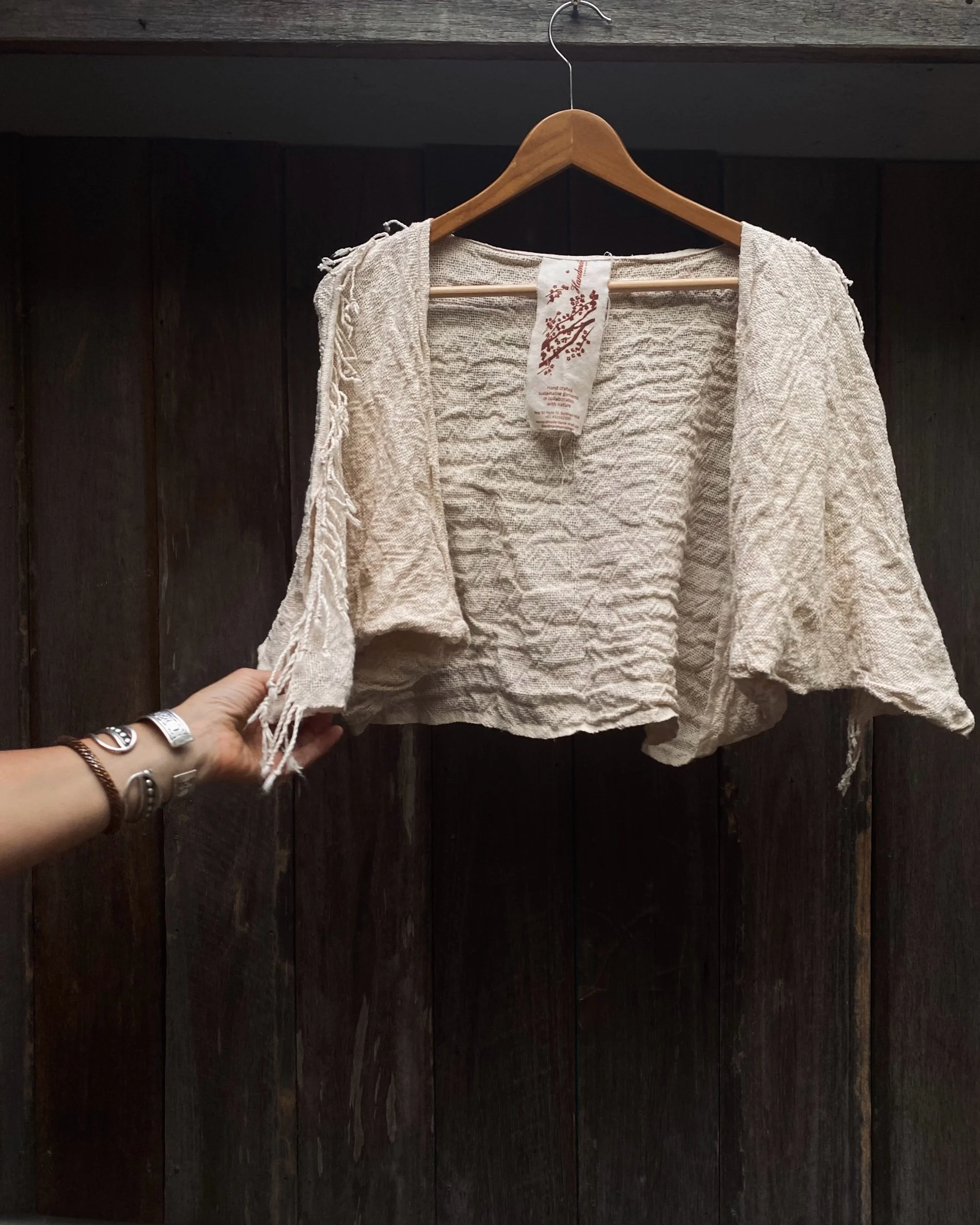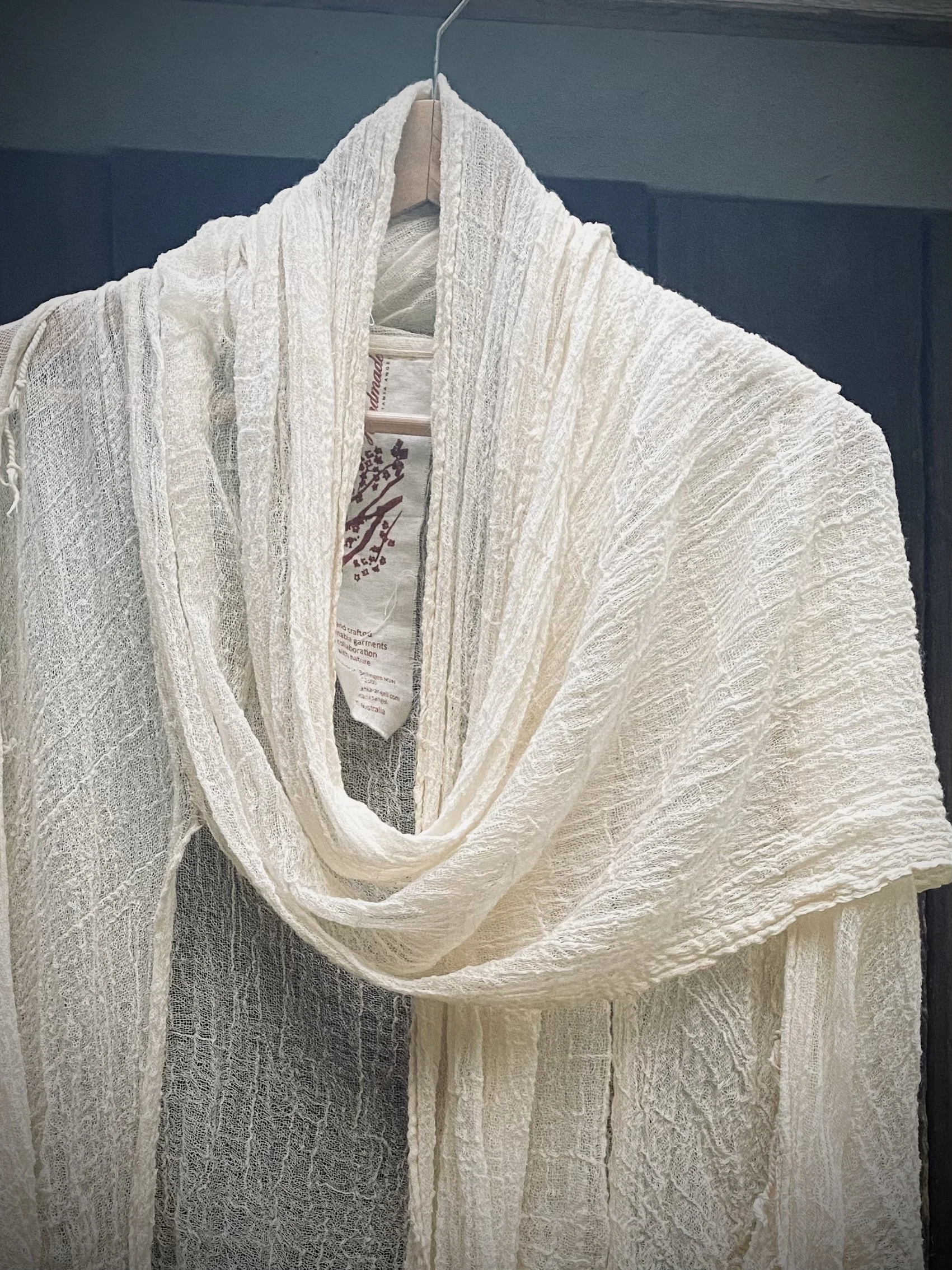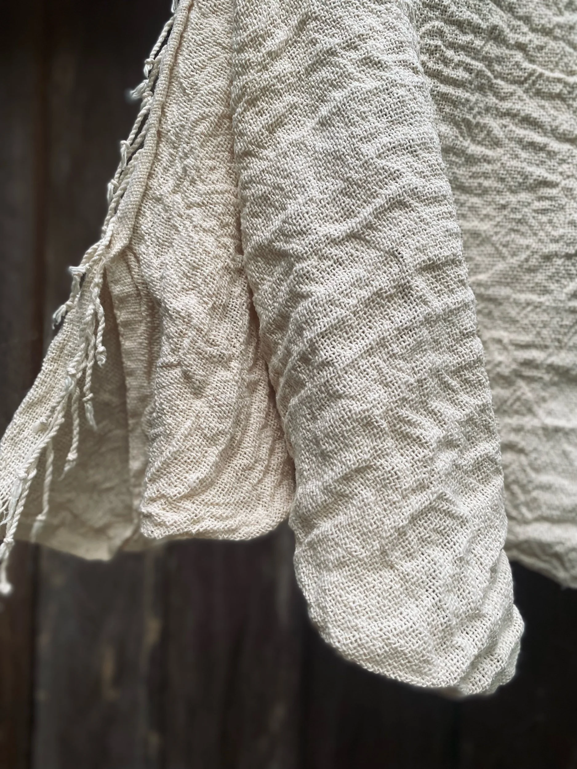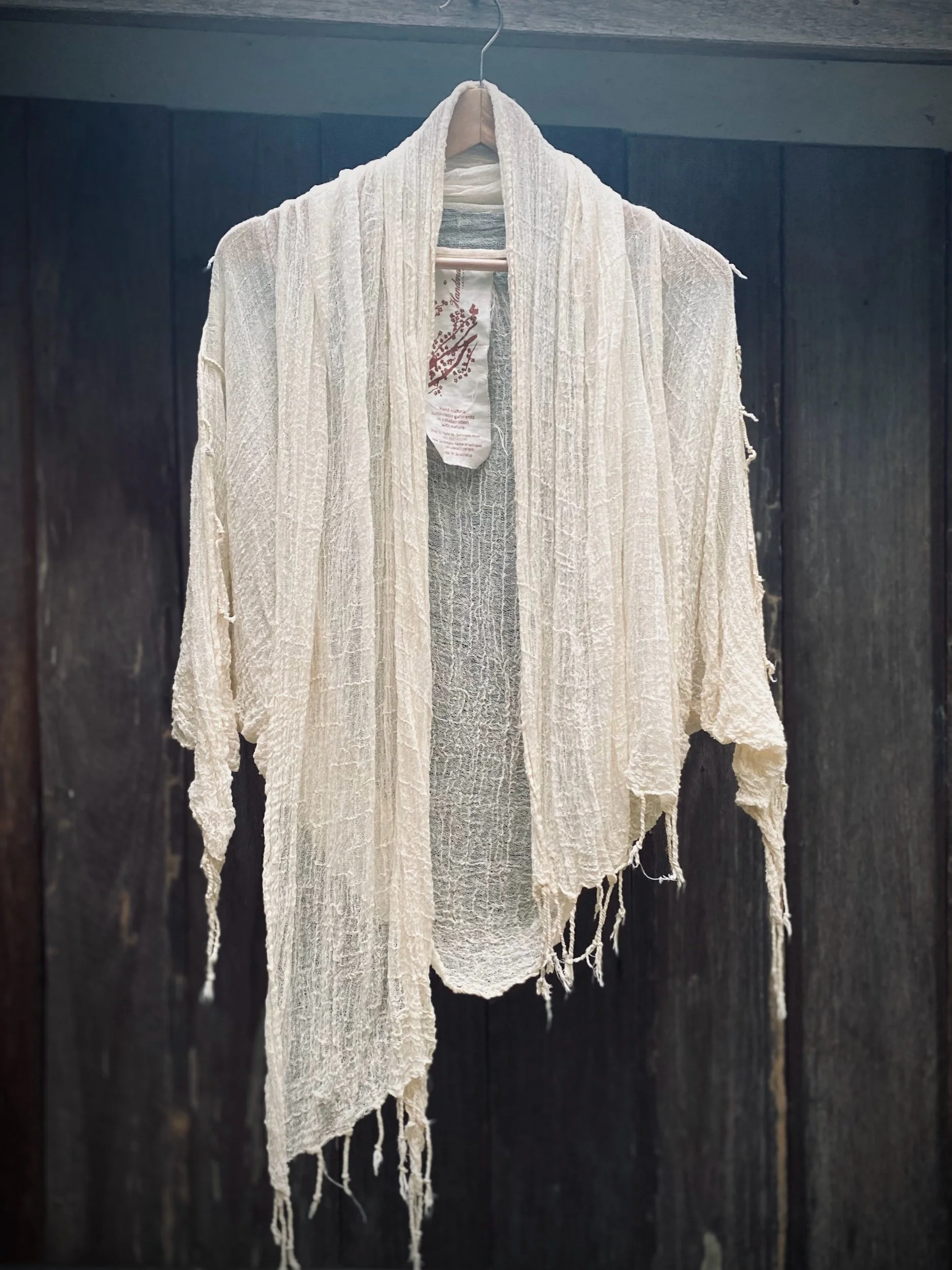 Place tassels on your shoulder line and allow the garment to drape beside your body. The scarf component can drape down or place over 1 or both shoulders.
