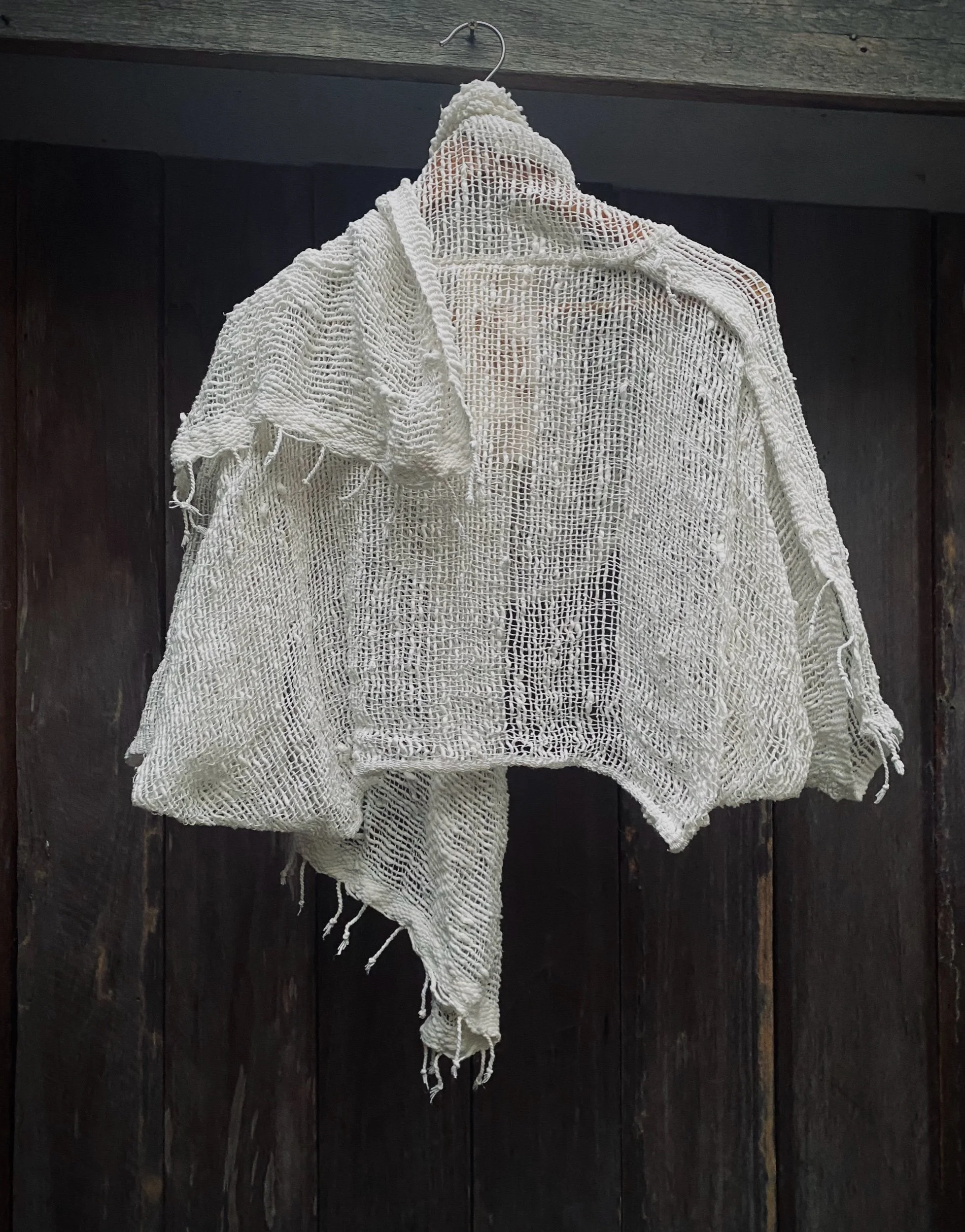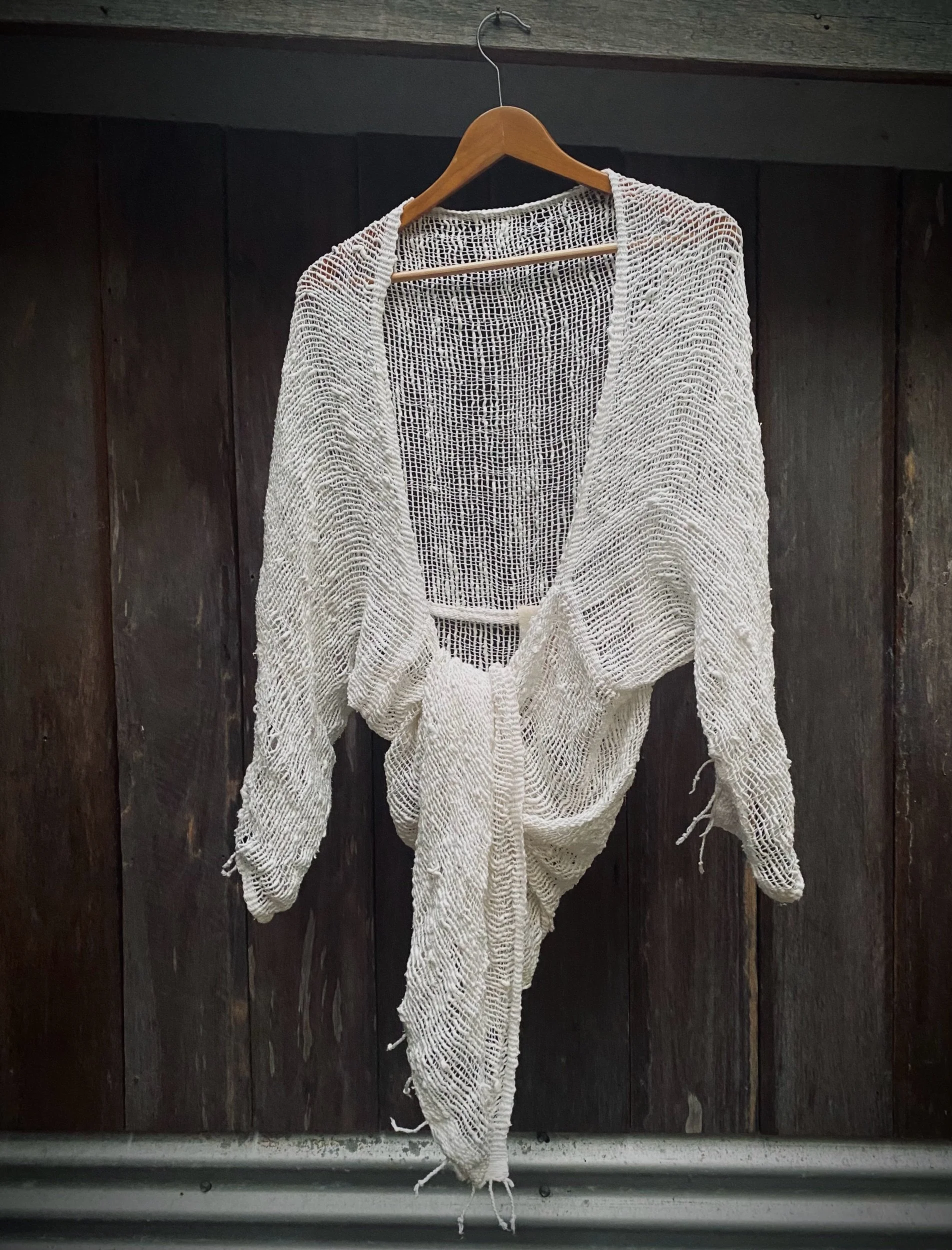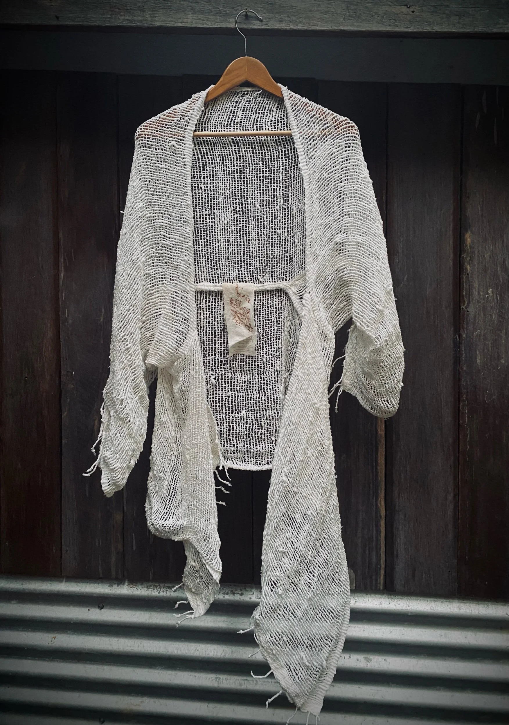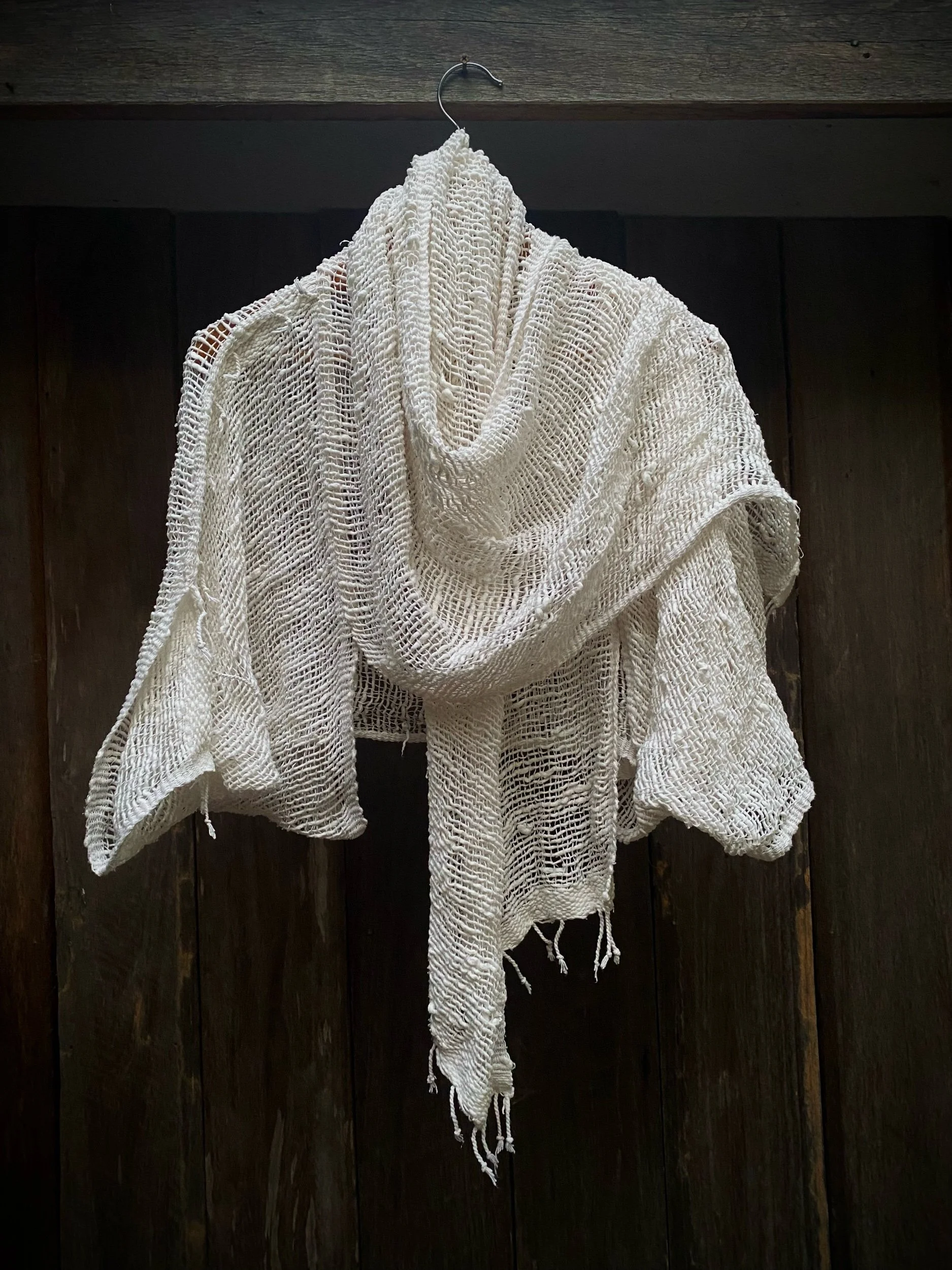 Place tassels on your shoulder line and allow the garment to drape beside your body. The scarf component can drape down or place over 1 or both shoulders.