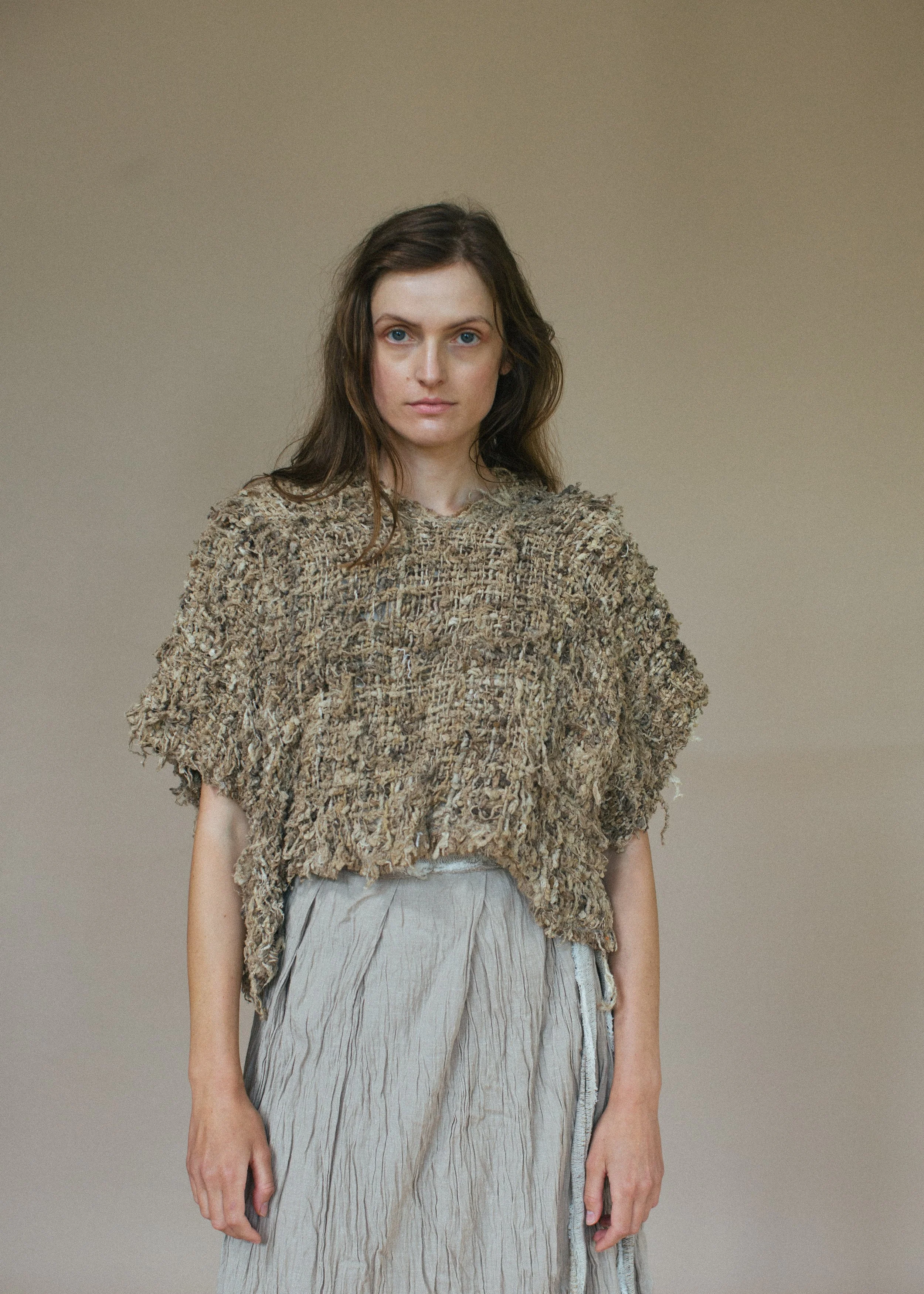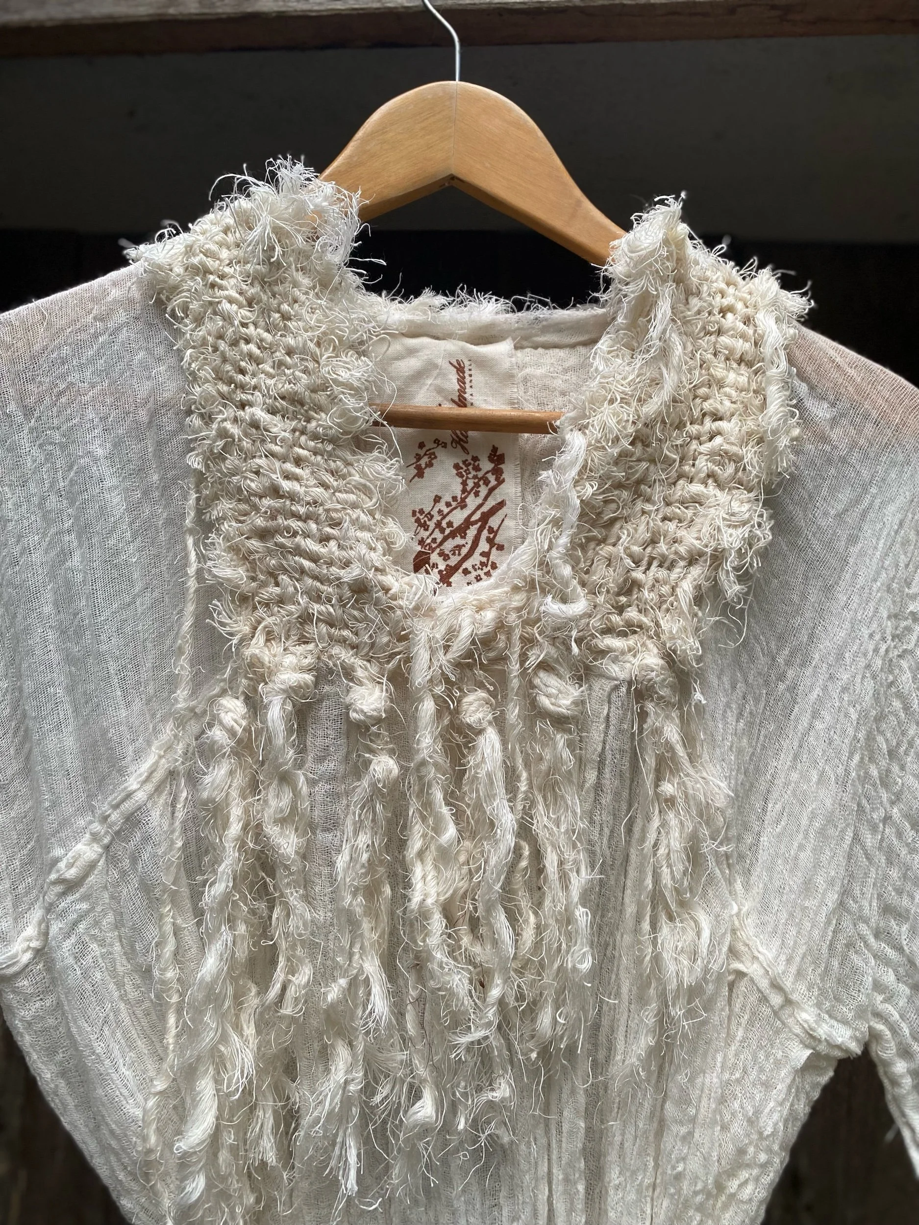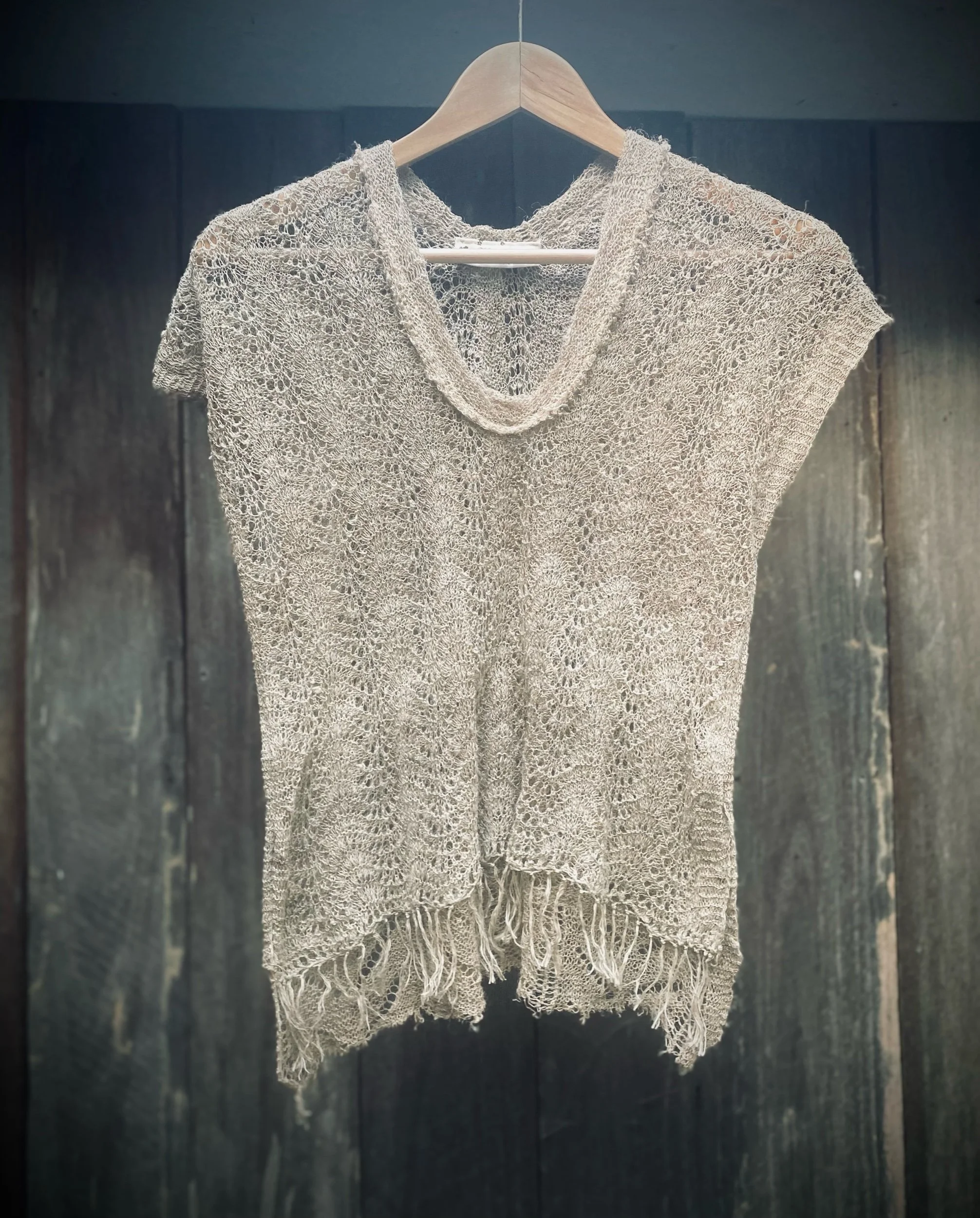 This top features a cross over back with handknitted nettle fibre ties.