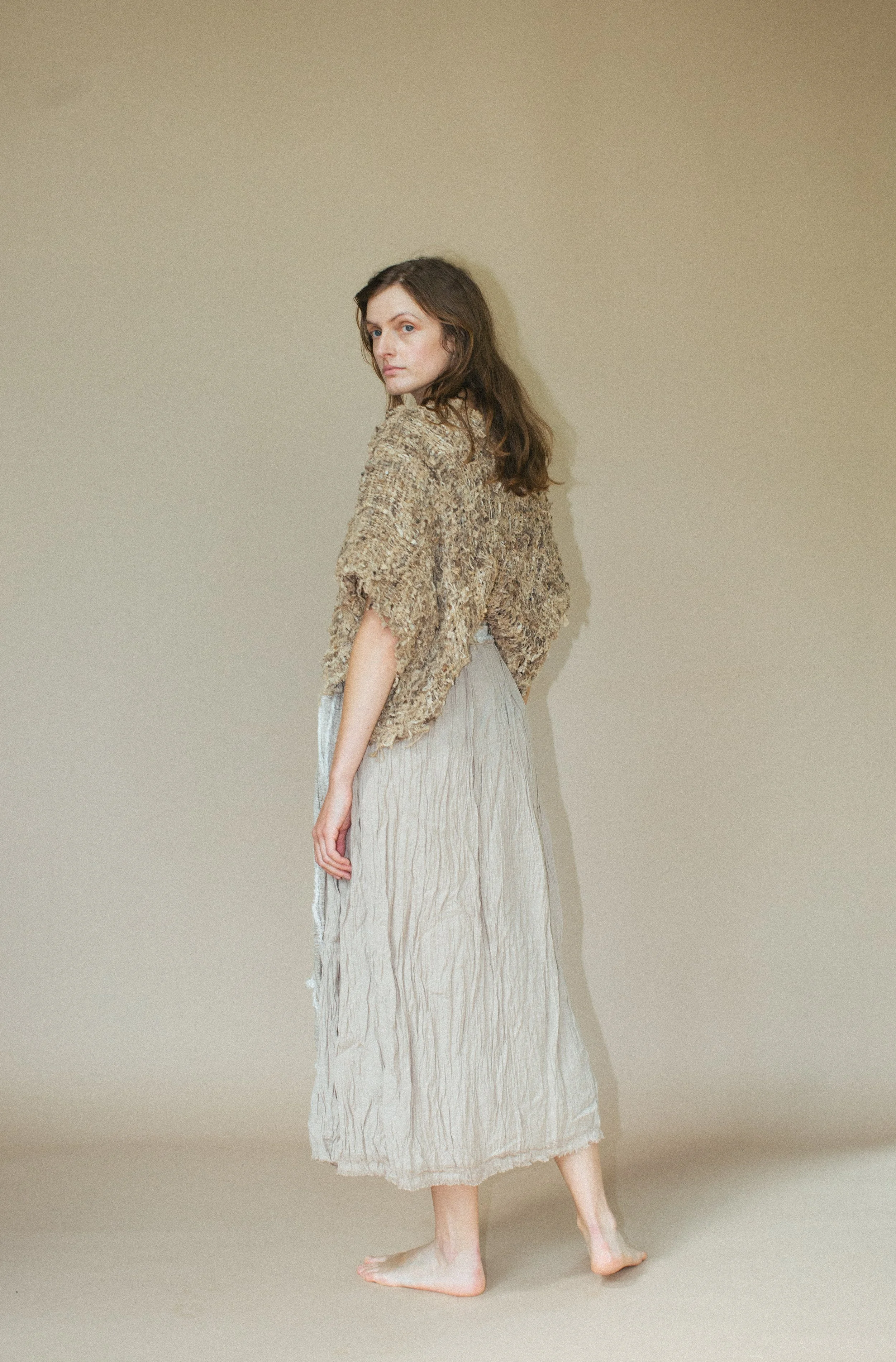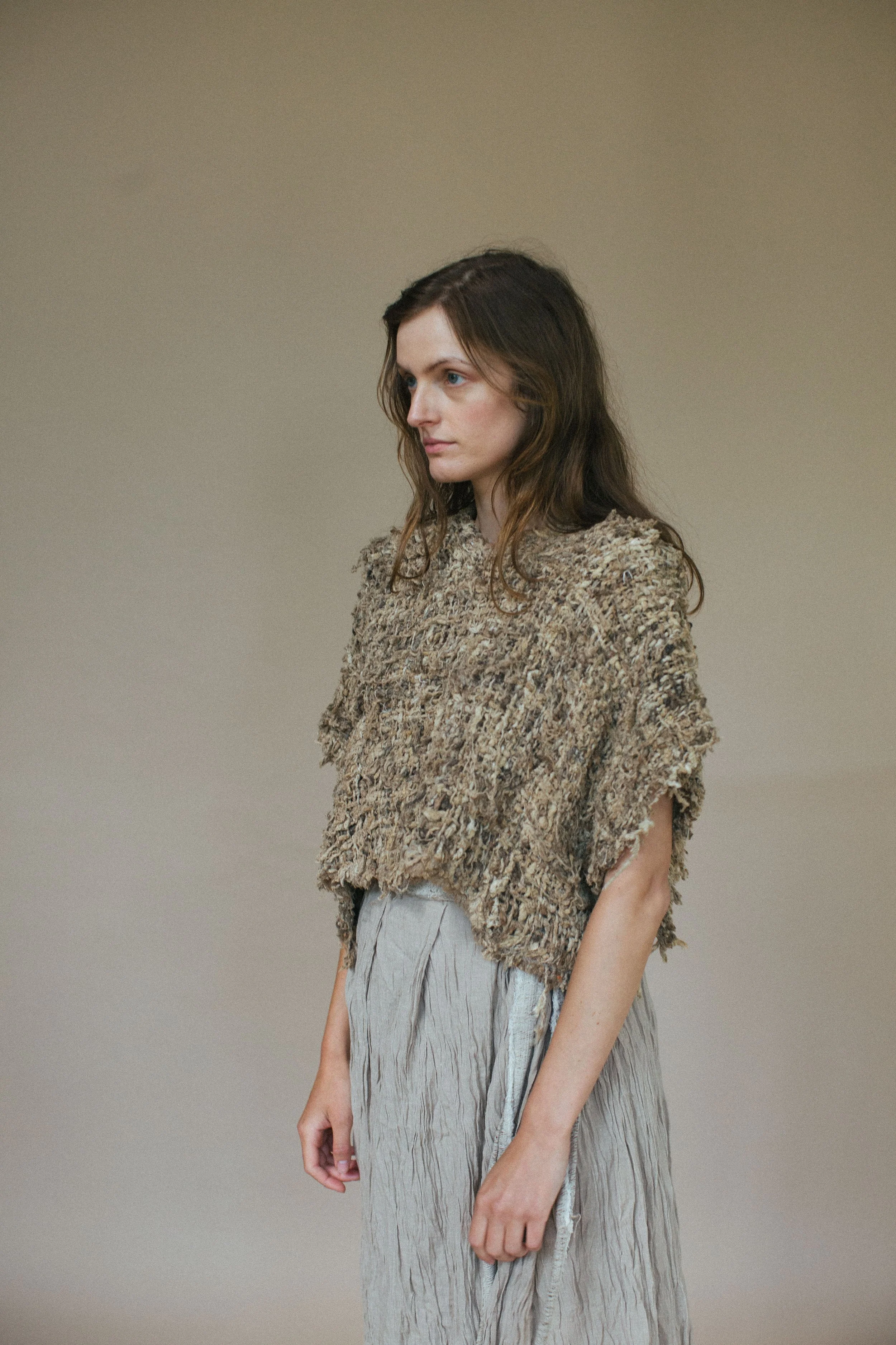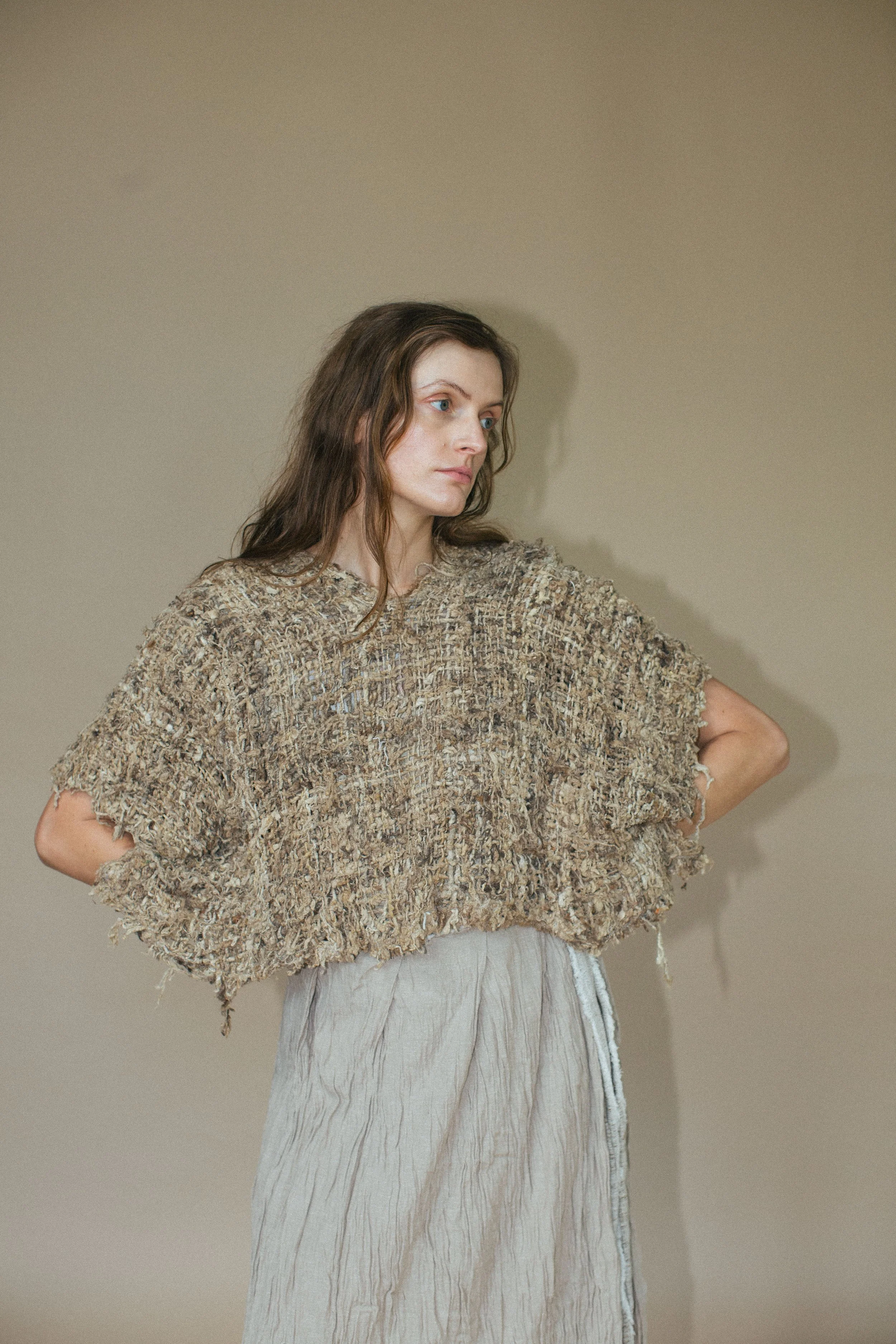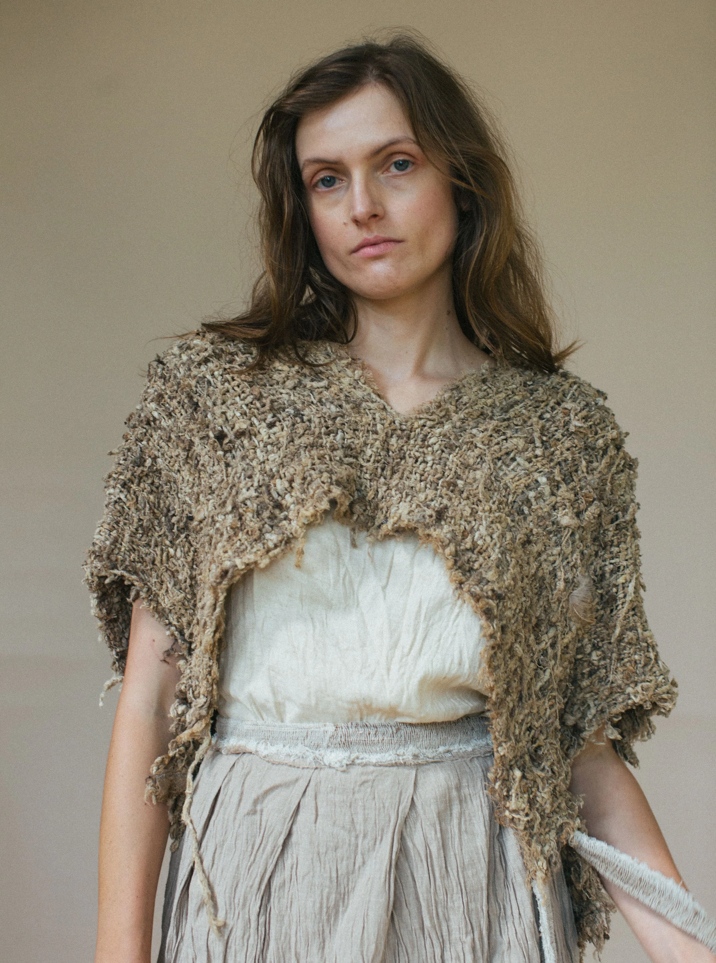 This top features a cross over back with handknitted nettle fibre ties.